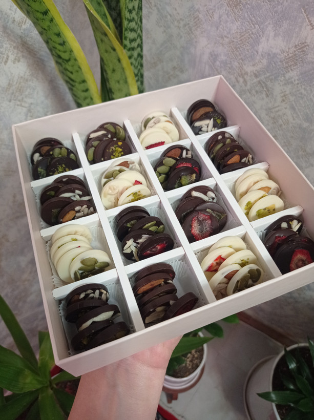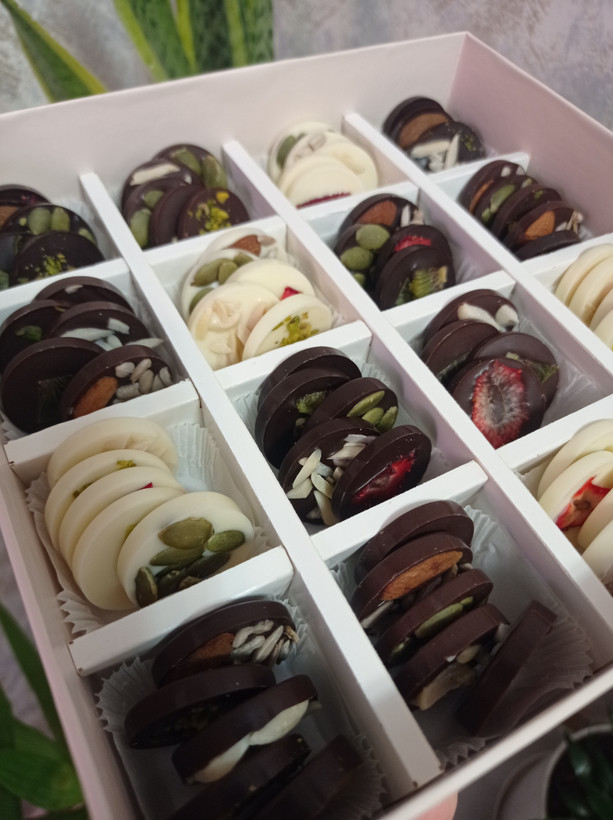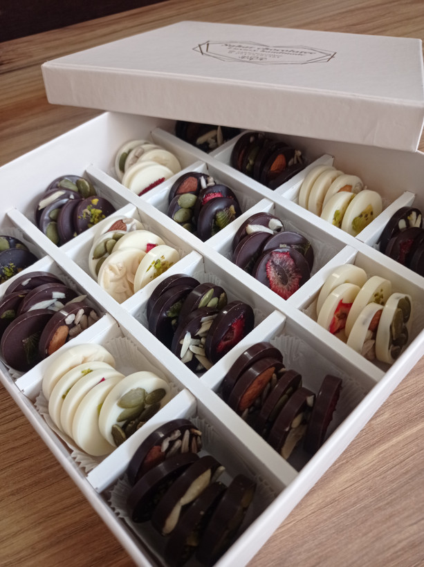 شکلات آجیلی 82عددی در سه طعم متفاوت از شکلات سفید،شیری و تلخ با مغزیجات متنوع مثل بادتم،تخمه،تخمه کدو،بادام زمینی و میوه های خشک ارگانیک کیوی و توت فرنگی،وزن تقریبی هرشکلات5گرم میباشد و کلیه محصولات دست ساز بدون هیچ گونه مواد نگهدارنده و اسانس آماده میشوند،ماندگاری محصولات 6 ماه میباشد و در باکس های طلاکوب شده به دست شما عزیزان میرسد.