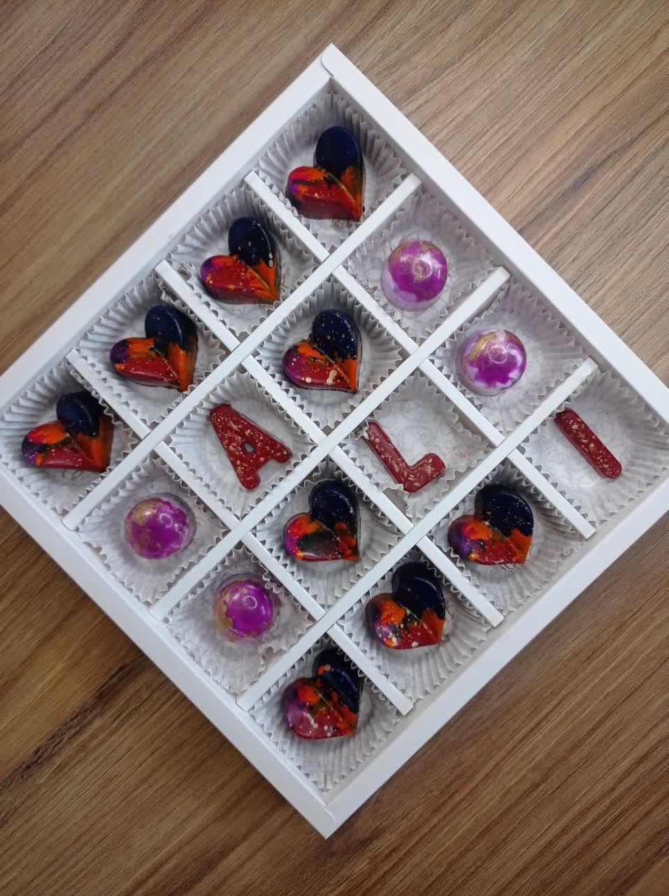 باکس حروف بن بن که طبق اسم درخواستی شما طراحی و آماده میشه،شما میتونید متناسب با اسمی که مدنظرتون هست از باکسهای 8-12-16-20 عددی سفارش دهید،این مدل اسم ALI متشکل از 13 شکلات بن بن با مغز نوتلا و 3 حروف اسم میباشد،قابل ذکر است کلیه محصولات با مواد اولیه ترک و بدون نگهدارنده تهیه شده است.