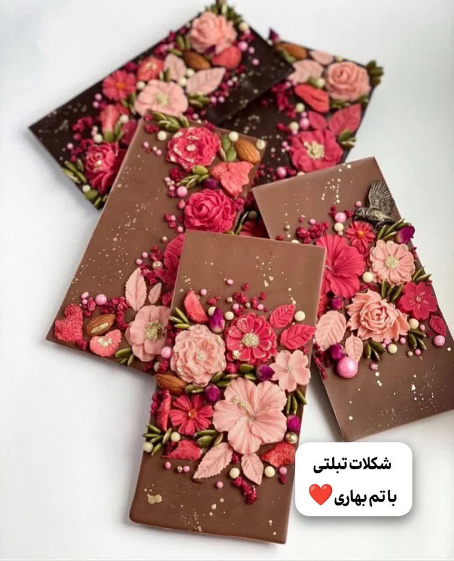 شکلات تبلتی با تم بهاری :ساخته شده از شکلات تلخ که بنابر ذائقه شما که میتونه هم شیری و سفید و یا میوه ای باشه و روی کار با شکلات سه بعدی با انوع شکوفه ها و مغزیجات تهیه شده.افتخار ما ساخت محصولاتی بدون هیچ گونه موادنگهدارنده و اساس هستش،درصورت هرگونه تغییر در قسمت توضیحات به آن اشاره نمایید یا با شماره 09013073923 تماس حاصل فرمایید.