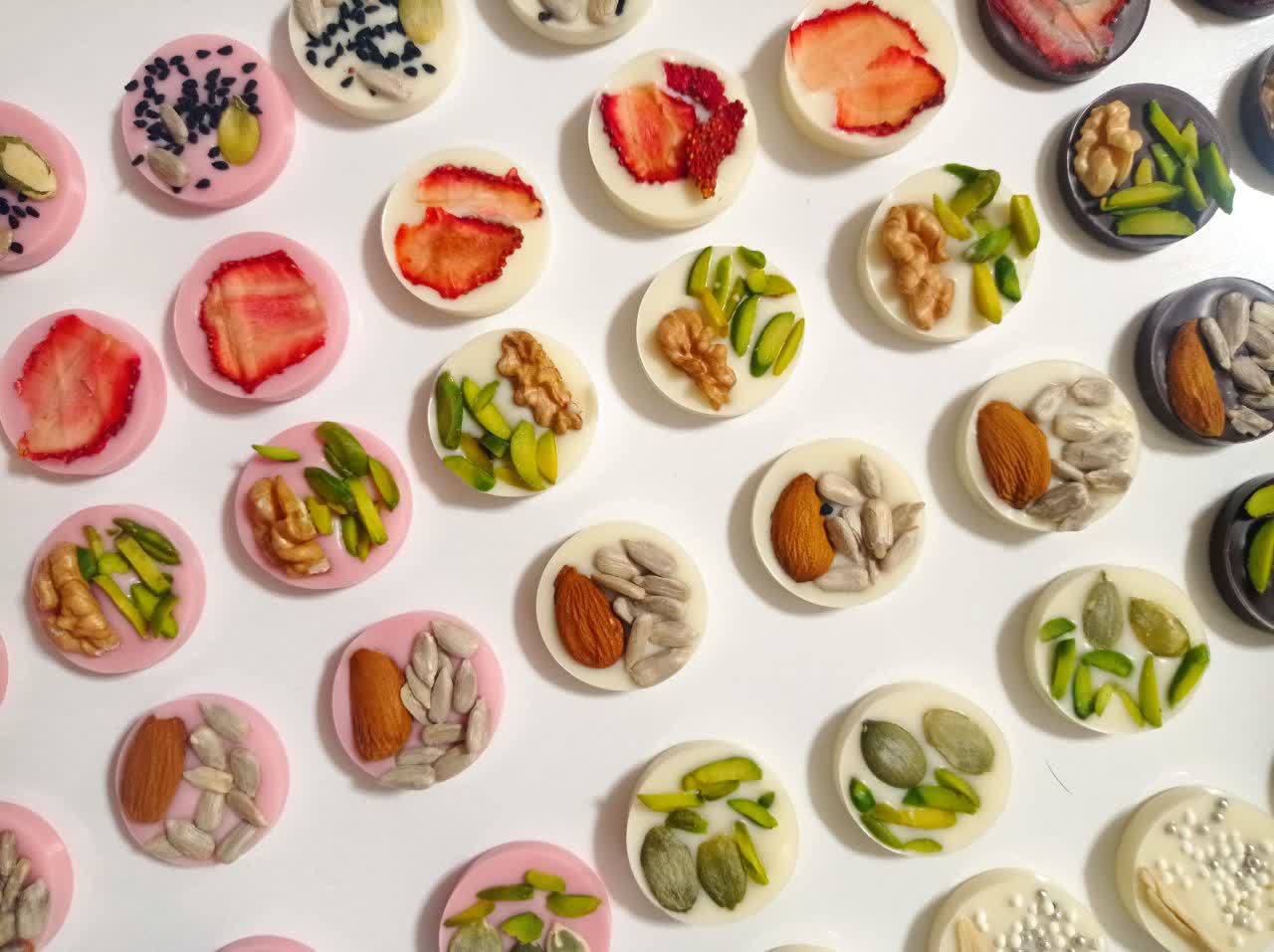در سه طعم شکلات تلخ،شیری و سفید که بنابر انتخاب شماست،همچنین وزن هر شکلات 5گرم میباشد که تهیه شده از مغزیجات متنوع مانند گردو،بادوم ،تخمه و... همچنین از میوهای خشک قابل ذکر است نوع و ترکیب شکلانهت طبق سلیقه شما انجام میشود،درصورت تغییر در سفارش و یا سوال با شماره 09013073923 تماس حاصل فرمایید.