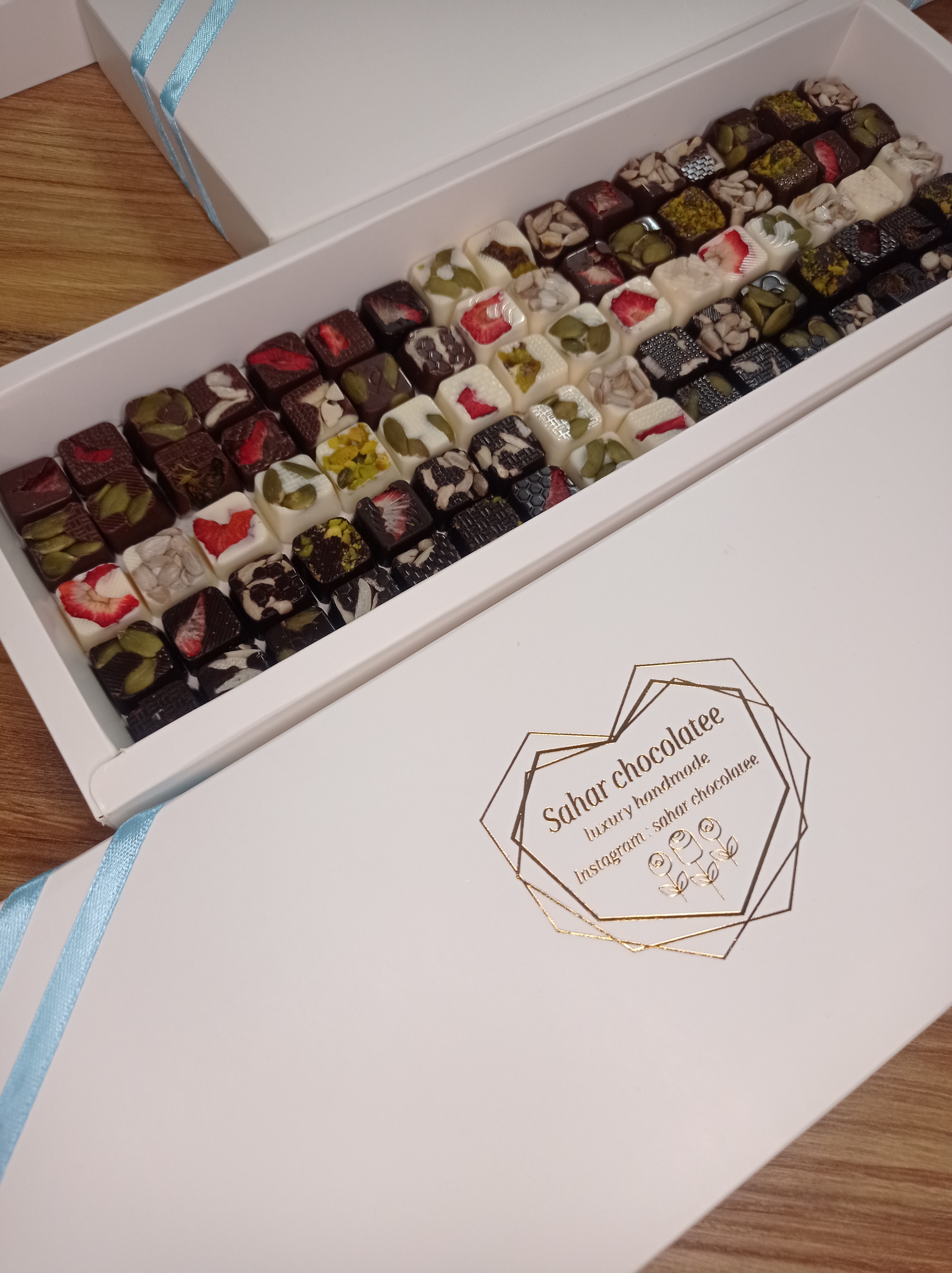 شکلات حبه قندی80عددی ساخته شده از سه نوع شکلات شیری و سفید و تلخ که وزن هرشکلات4گرم میباشد،مغزیحات استفاده شده در این مدل پودر پسته،بادوم،تخمه و میوه های خشک ارگانیک کیوی و توت فرنگی میباشد،چیدمان و تعداد هر نوع از شکلات به دلخواه شما خواهد بود،درصورت هرگونه تغییر در سفارش با شماره 09013073923 تماس حاصل فرمایید.