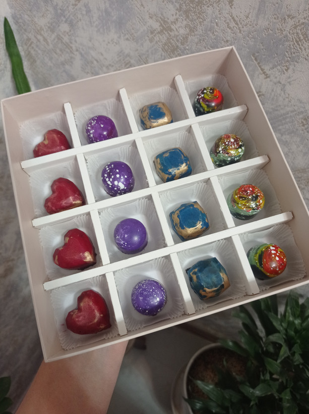 باکس بُن بُن 16 عددی آماده شده در 4قالب با تنوع و ترکیب رنگ بینظیر،مغز شکلاتها از کره لوتوس،نوتلا و قهوه میباشد،این ترکیب آماده شده از بهترین و درجه یک ترین شکلاتهای رییل در بازار میباشد،قابل ذکر کلیه محصولات بدون افزودنی و اسانس میباشند و در طرح و رنگ دلخواه شما آماده میشوند،ماندگاری این محصول دوماه میباشد و درصورت هرگونه تغییر در سفارش یا سوالات احتمالی با شماره 09013073923 تماس حاصل فرمایید.